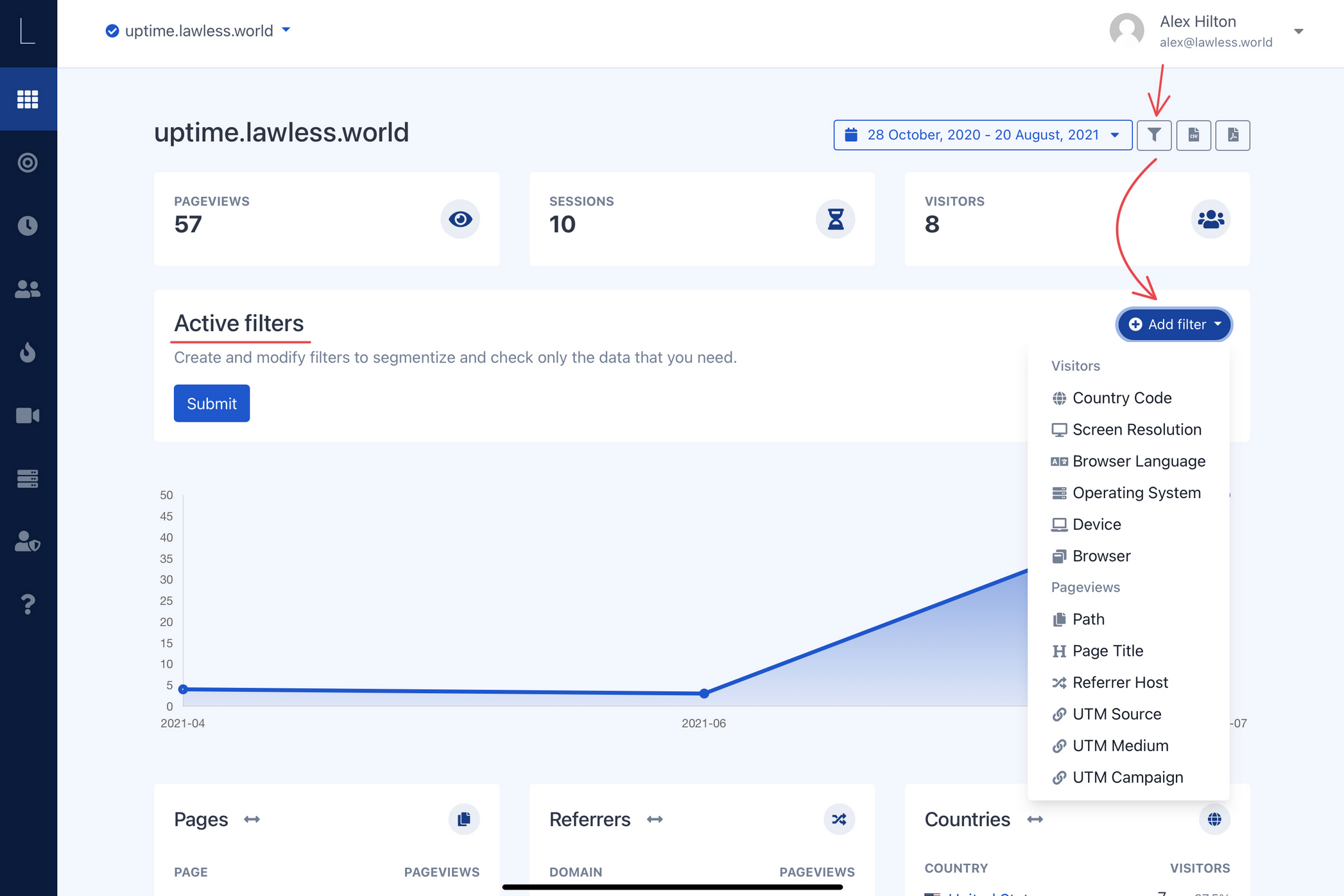In the image above clicking the filter icon to the right of the date picker will bring the option to add filters to your web data. You can make a unlimited number of combinations and can export the results there after.